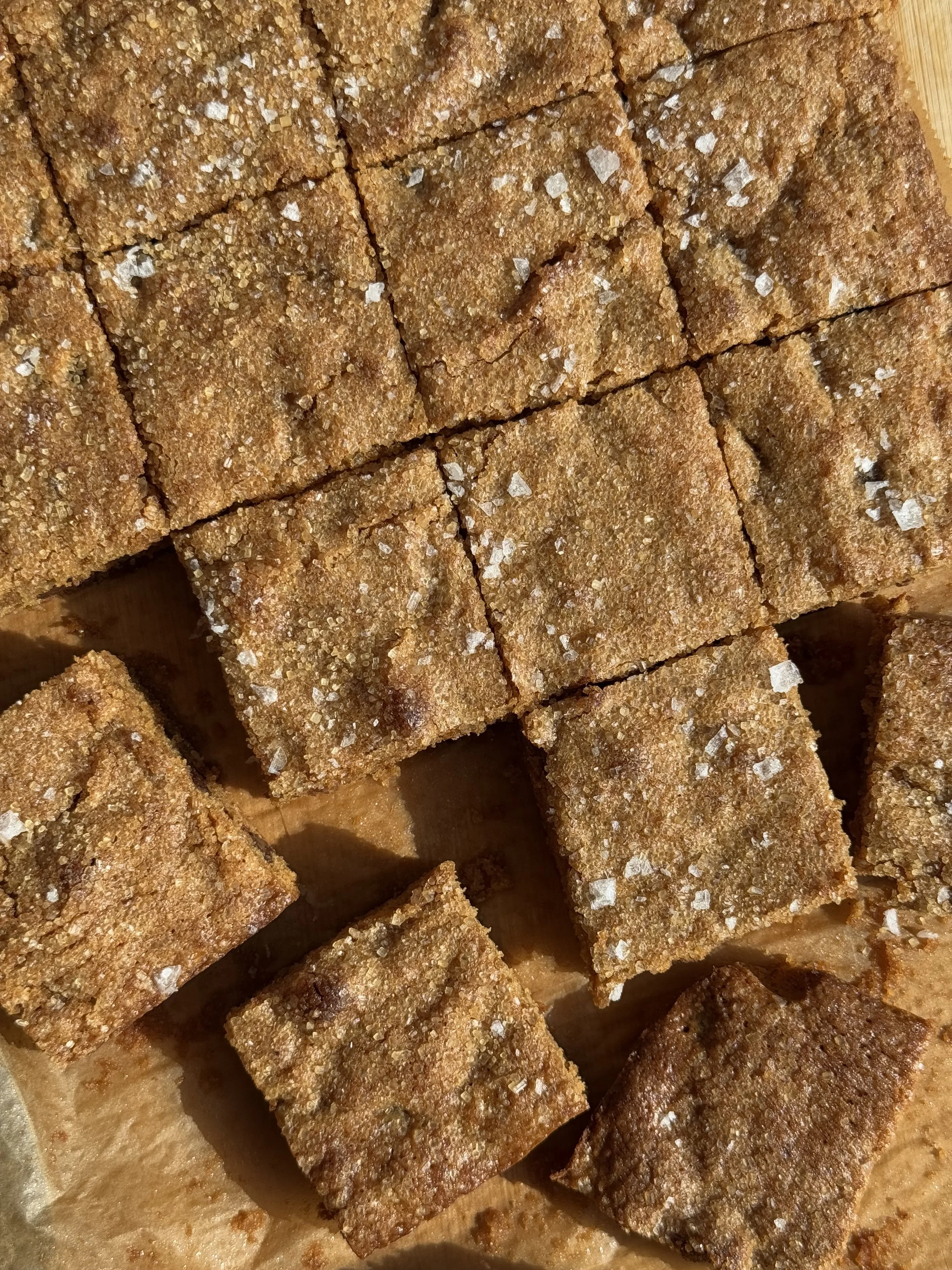 I took inspo from that and created these blondies since I wanted something chewier, less formal and really easy to whip up. I never really undertood the term ‘snacking cake’, but I now get it. These blondies are thin - so texturally, they’re chewier, but still retain that cakey, fluffy quality a slice of banana bread has. They’re magical and you genuinely can’t only have 1 slice. Also, don’t skip the dark brown sugar, demerara and flakey salt combo - this replaces the butterscotch that was in the Outlier version. It perfumes the blondies with a salted caramel flavour, without making it sickly sweet.