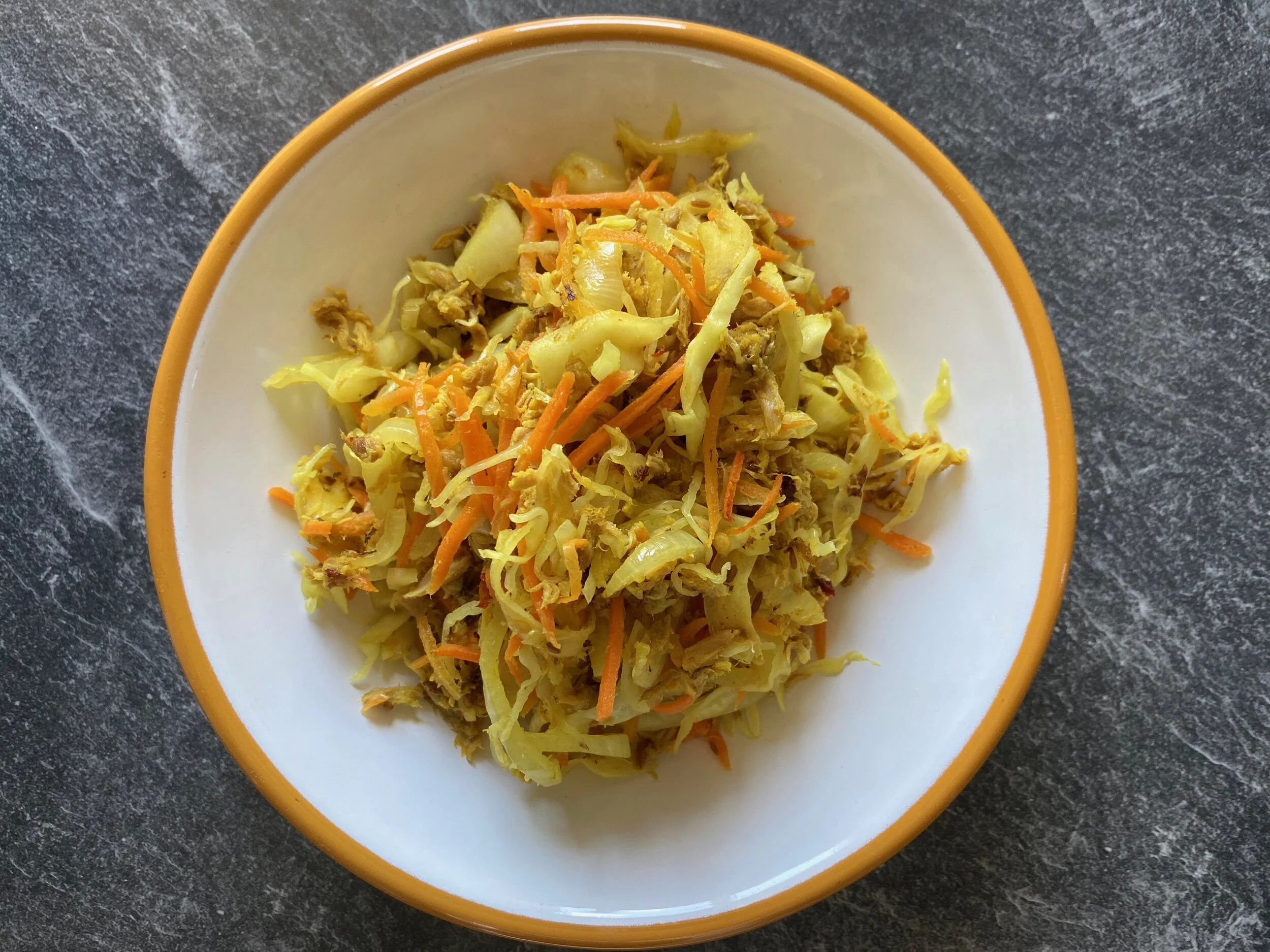 This is a side dish my mum made so much growing up that after a bit I couldn’t stand it anymore. I went a long time avoiding it, until one day I decided to give it another go. It’s a simple stir fry that uses ingredients you should have on hand almost at all times; tinned tuna, cabbage, carrots, onion, cumin, turmeric, red chilli flakes and apple cider vinegar. Super simple to whip up, takes no time and makes a perfect side.
