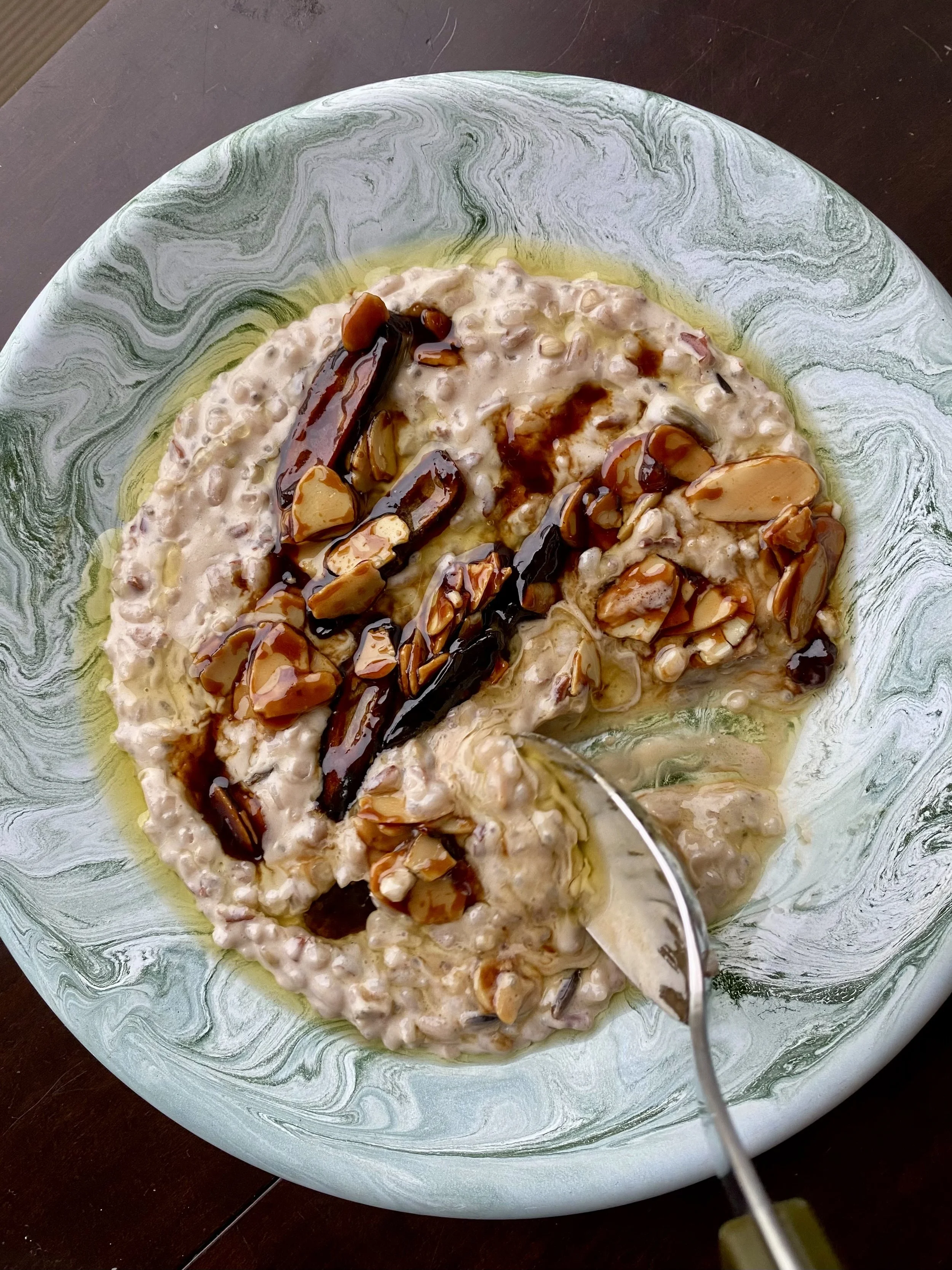 This can be made ahead, add the grain porridge into an airtight container and keep in the fridge for up to 3 days, you can eat it cold or reheat until hot. The date mixture can sit in an air-tight container at room temperature until needed.
