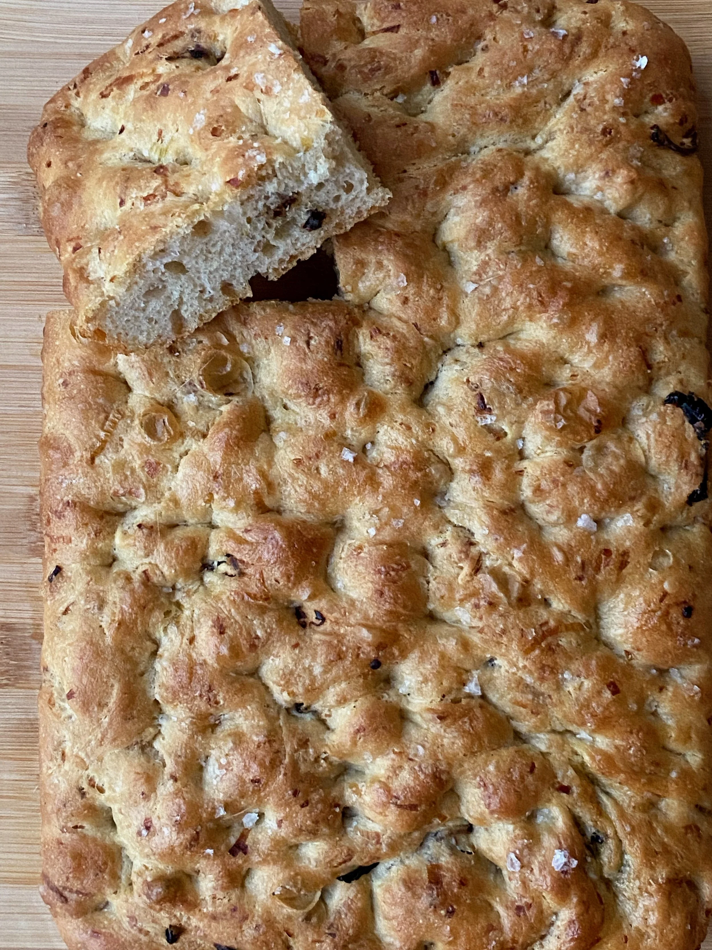No-knead Caramelised Leek and Sun-dried Tomato Foccacia