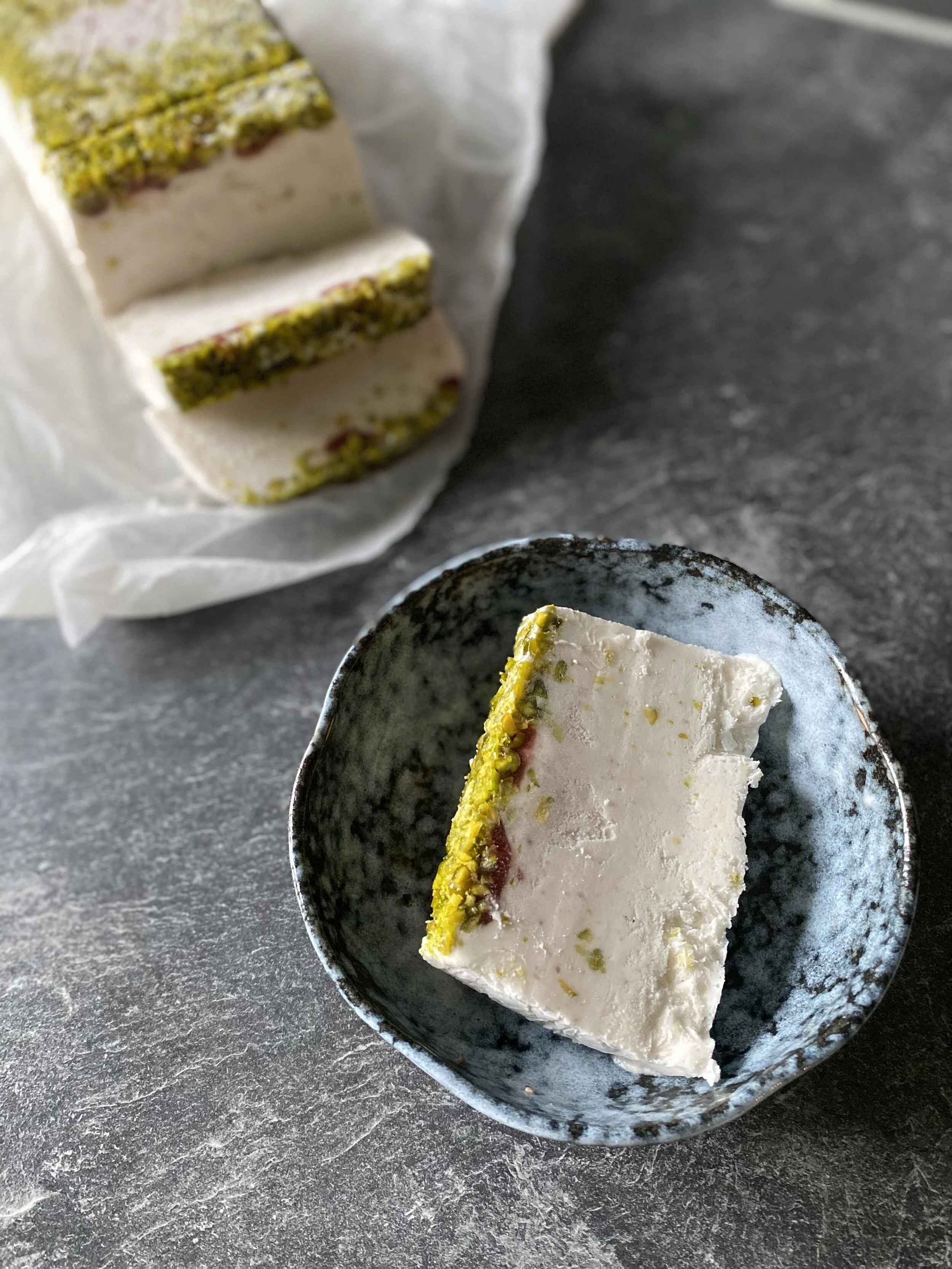 Vegan Cardamom Semifreddo with Strawberry Rose Jam & Pistachios